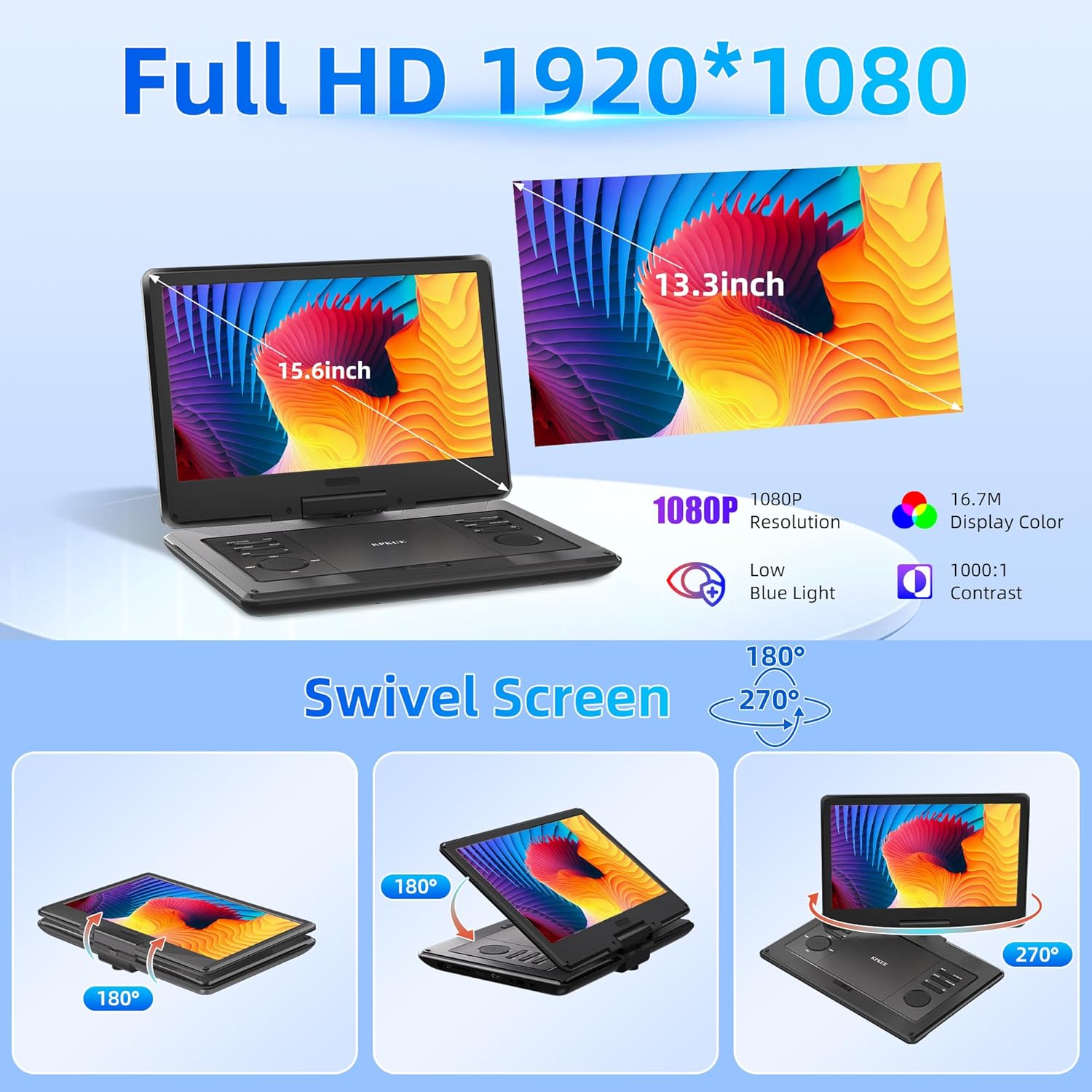 【Bigger Swivel Screen & 2 Surround Speakers 】 KPKUE 15.6″ portable DVD player with 13.3inch 1920*1080 FHD swivel IPS large screen. FullHD and low blue light screen pertect for eyes with long-time watching. KPKUE dvd player portable has 270° rotation and 180°flip feature enjoying extreme viewing experience and easy watching comfortably.This portable tv for camping has two stereo speakers and 1 headphone jack meets your needing for home/camping/car/Traveling sharing or enjoy it by yourself.