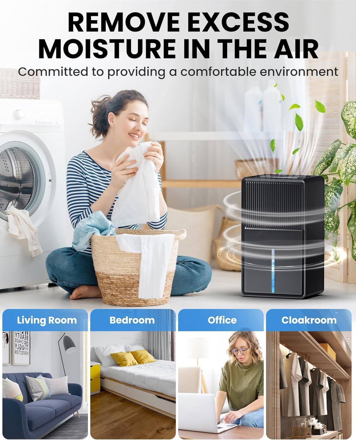 【Smart auto-stop, safe and portable 】It is equipped with an intelligent sensing system. When the water tank is full, the device will automatically shut down and light up a red indicator light to prevent water overflow and ensure safe operation even without supervision. The lightweight and portable design can be flexibly placed in various scenarios such as bathrooms, basements, wardrobes, kitchens, and bedrooms, solving the problem of dampness anytime and anywhere.