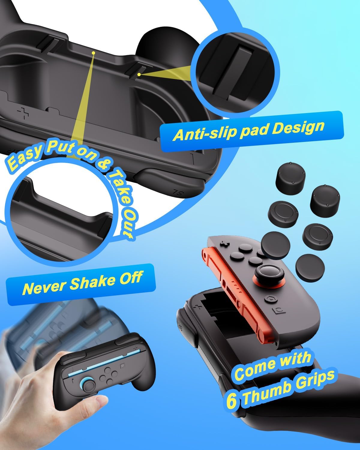 【More Grip, More Value】This Joy-Cons controller accessory set includes 2 ergonomic Joy-Con grips and 6 rubber joystick thumb grips that protect the joystick surface from wear, scratches, and long-term damage, keeping your Joy-Con in top shape for the long run. Available in 3 heights so you can fine-tune your setup for racing, fighting, or everyday gaming.