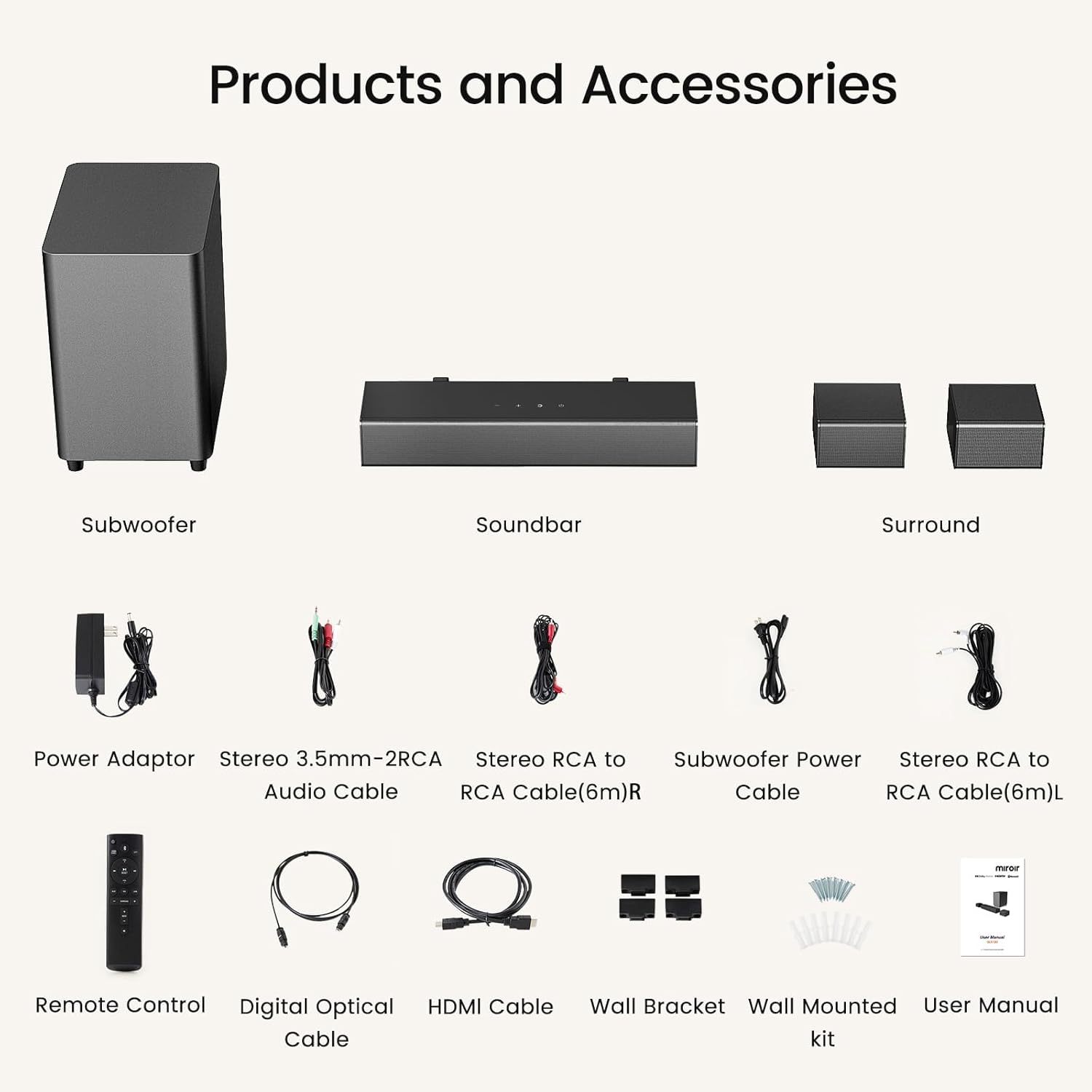 Immersive 5.1 Surround Sound: 3-channel soundbar + 2 wired surround speakers + 1 wireless subwoofer, creating a full-range stereo field, clear dialogue, low-frequency shock, providing you with a real cinema-level experience for smart tvs
