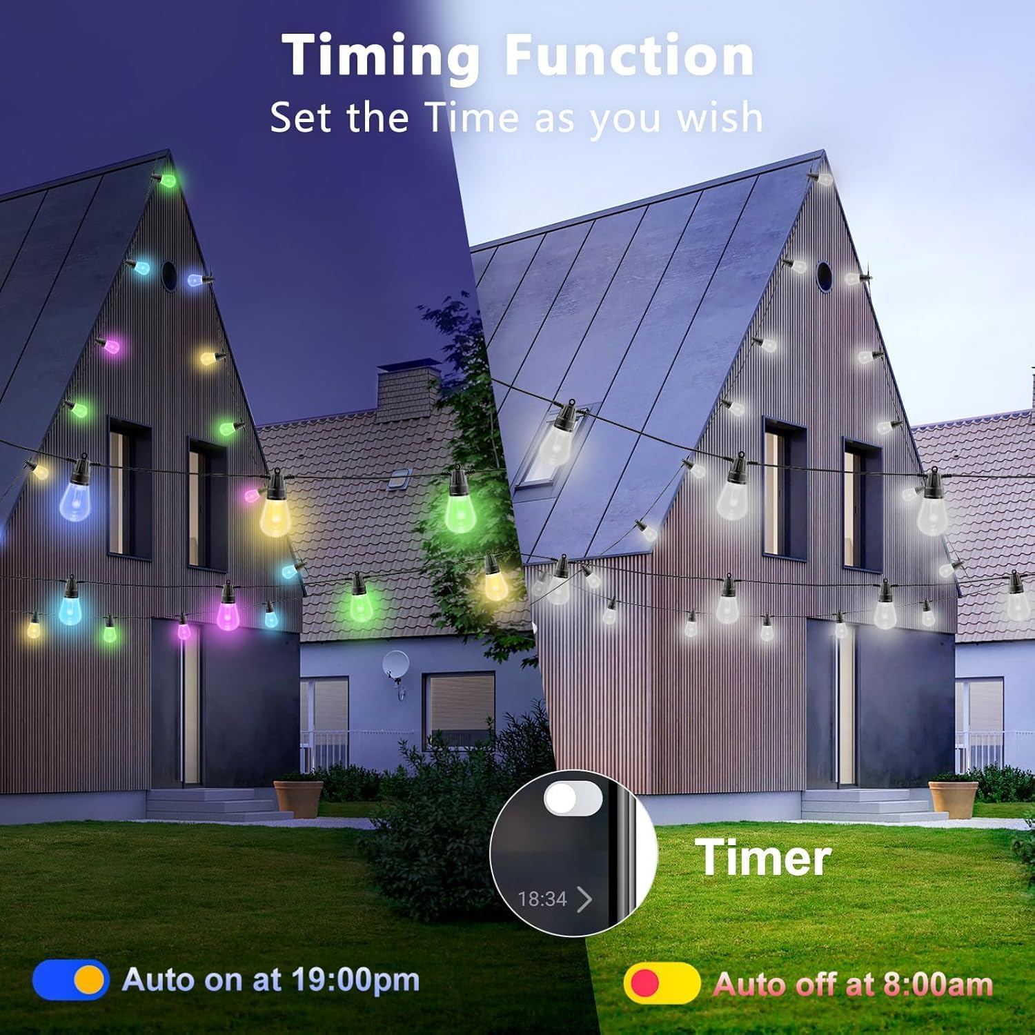5šćWidely Applicable Backyard LightsćOur outdoor lights string provides lots of lights for decks, porches, gates, patios, bistros, walkways, restaurants, gardens, tents, backyards, weddings, casual, dinner parties, Christmas, and Halloween Celebrations. ćTimer and Scheduleć- With the schedule setting function of the APP, you will be able to have LED String Lights come on and go off at a certain time so you never have to remember to turn them on or off.